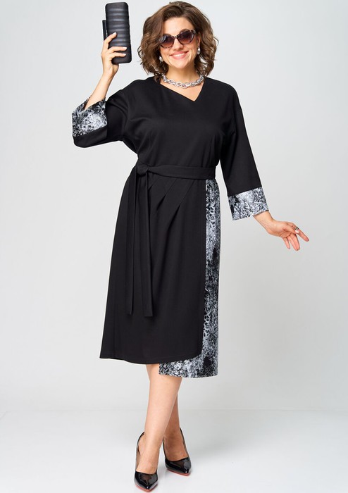Платье женское повседневное полуприлегающего силуэта, выполнено из трикотажного полотна двух дизайнов. Вырез горловины фигурный на обтачке. Плечо спущенное. Рукав втаной 7/8, по низу на притачной манжете из отделочной ткани. По переду юбки фигурные складки и ассиметричный запах со вставкой из отделочного трикотажа. Декором платья служит съемнй пояс и детали из отделочного трикотажа.