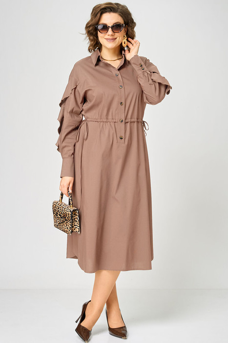 Платье женское полуприлегающего силуэта до пояса в стиле "платья-рубашки", выполнено из однотонного хлопка. Трендовый фасон, который сочетает в себе коморт повседневной вещи и элегантность праздника. Вырез горловины воротник на стойке рубашечного типа, застежка планка чуть ниже талии на обметаннве петли и пуговицы. Плечо спущенное, рукав втачной по центру разрезной со вставкой в виде волана на притачной манжете, что придает изделию легкость и изюминку. По полочке и спинке кулиса с руликом входящим к боковым швам. "Идеальная" талия за 1 секунду. Встроенная кулиска с регулировкой - это гениальное решение, которое подстраивается под вашу фигуру и Вы сами создаете свой восхитительный образ и регулируете свои обьемы. Низ платья фигурный закругленный к боковым швам, что создает удобство в носке и небанальность в изделии. В боковых швах обработаны разрезы. Декором платья служат отделочные пуговицы, кулиска и необычные воланы по рукавам.