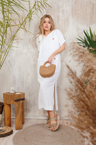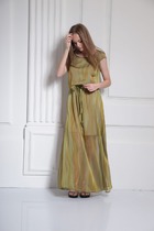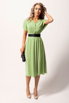 Платье женское нарядно-повседневное полуприлегающего силэта до талии расширенное к низу. Платье отрезное по талии на трикотажной подкладке, выполнено из креп-шифона. Вырез горловины V-образный обработан обтачкой, по горловине полочки и спинки двойные воланы. Рукав втачной по низу на резинке. По юбке небольшие складки. В боковых швах обработаны разрезы, низ фигурный. Декором платья служит съемный пояс из основной ткани и рюши по горловине платья.