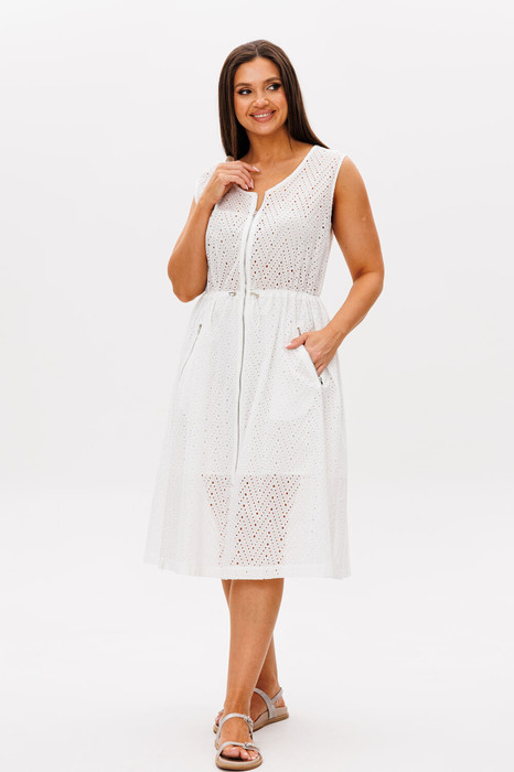 Платье без рукава с отрезным лифом и конической юбкой - силуэт песочные часы. По центру полочка - сквозная застёжка -молния. На передних полотнищах юбки - прорезной карман с молнией. По талии - кулиса с регулирующейся тесьмой и фиксаторами.