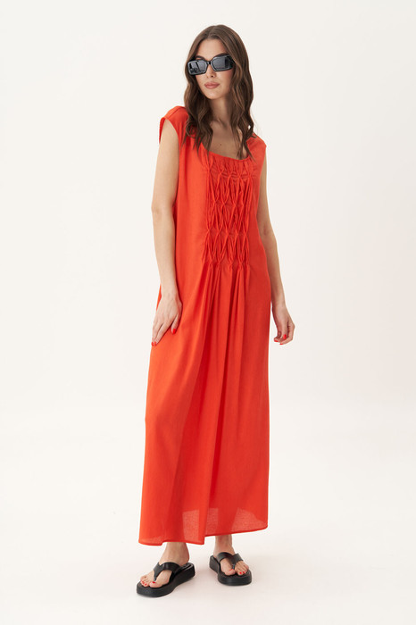 Свободный А-силуэт, покрой с заниженной линией плеча, длина макси. Полочка с эффектным вырезом и авторскими сложными буфами. Спинка - со средним швом.