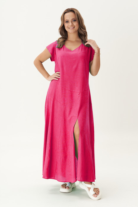 Свободный А-силуэт с цельнокроенным рукавом, ассиметричные линии членения отрезной нижней части платья с коническими вставками и эффектным разрезом. Оригинальный вырез горловины с завязкой-бантом на спинке.