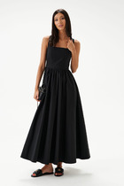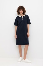 Свободный А-силуэт, заниженная линия плеча, круглая горловина, переходящая на спинке в V-образный вырез с кулисой, завязывающейся на бант. На спинке - центральная застёжка.