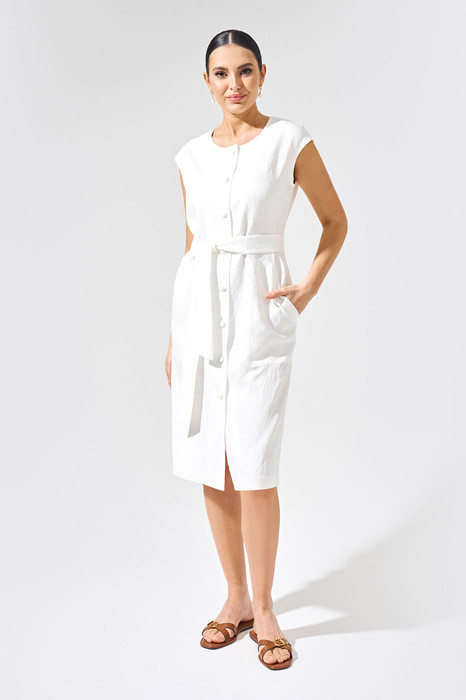 Женское классическое платье-халат полуприлегающего силуэта выполнено из легкой натуральной струящейся ткани "тенсель". По переду изделия накладные функциональные карманы, линия плеча немного спущена, застежка на петли и пуговицы. В комплекте съемный пояс из основной ткани.