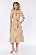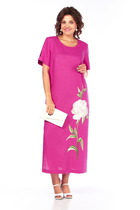 Платье женское прямого силуэта, длиной до середины колена. Рукав рубашечного покроя, длинный. Линия плеча немного спущена. Платье выполнено из трикотажного мягкого полотна, с хорошей растяжимостью.Членения спинки и переда ассиметричные. Горловины круглая, обработана узкой бейкой. В нижней части переда слева расположено пришивное украшение— апликация.