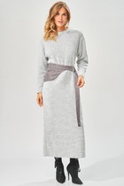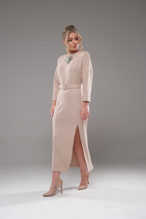 Платье женское трикотажное, полуприлегающего силуэта.По переду рельефе обработан разрез. Спинка с рельефами идущими от плеча и выточками по линии талии. Горловина лодочка. Рукав 3/4 со спущенной линией плеча.