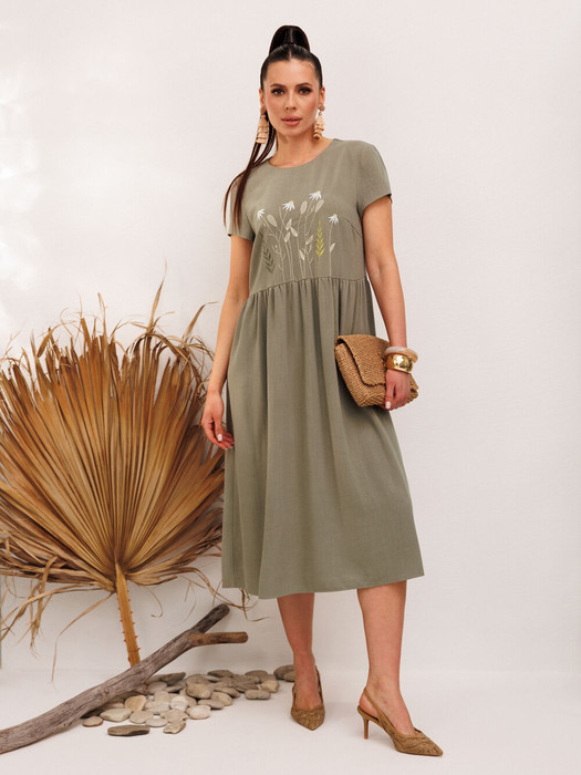 Платье женское отрезное по линии талии, льняное. Перёд с нагрудными вытачками идущими с боковых швов. На верхней части переда расположена декоративная вышивка. Горловина круглой формы. Спинка со средним швом, в которой расположена застёжка горловины на одну пуговицу. Нижняя часть платья собрана на сборку. Рукава одношовные, короткие, гладкие.