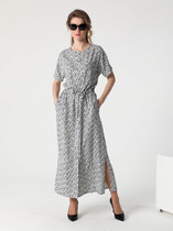Платье женское нарядное. Силуэт полуприлегающий. Платье отрезное по линии талии. По горловине заложены складки, по одному плечу вставка из шифона и украшен декором. Спинка со средним швом с застёжкой на потайную молнию. От талии вставлена юбка из шифона на сборку. По талии съёмный пояс из шифона. Платье на подкладке от линии талии. Длина платья 122 см.