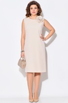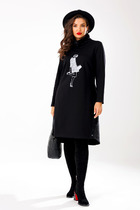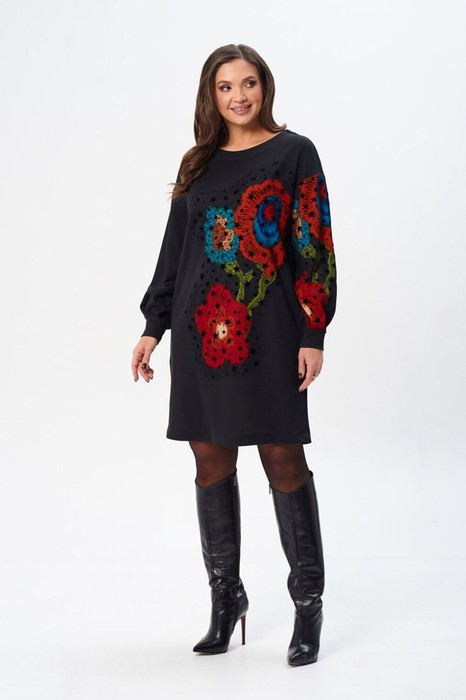 Платье свободного силуэта из трикотажной ткани с принтом. Рукав втачной одношовный со складками по низу и манжетой. В боковых швах карманы. Горловина обработана планкой в форме лодочки. По переду в в ерхней части настрочена сетка. Длина платья - 91 см , длина рукава платья - 53 см.