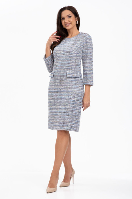 Платье с застежкой на потайную молнию в среднем шве спинки, без воротника, с круглым вырезом горловины, и доплнительной застежкой на петли и пуговицы по левому плечевому шву. По переду с нагрудными вытачками. На уровне линии бедер расположены отделочные клапаны, зафиксированные к платью петлей и пуговицей. Спинка со средним швом, талиевыми вытачками. Рукав втачной, 3/4.