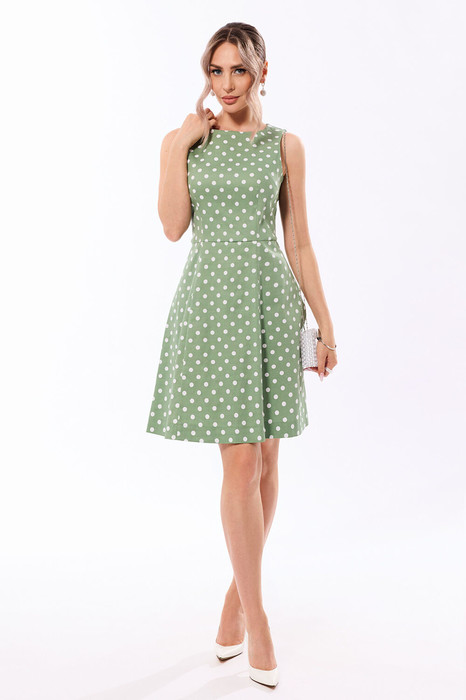 Платье с застежкой на потайную молнию в среднем шве спинки, без воротника, с круглым вырезом горловины, без рукавов. По переду с талиевыми вытачками. Платье отрезное по линии талии. Нижняя часть переда и спинки расклешенная, с двумя рельефными швами. Спинка со средним швом.