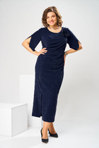 Платье, с центральной двубортной застежкой на пришивные кнопки, с отложным воротником и лацканами. Верхняя часть переда с нагрудными вытачками. Верхняя часть спинки со средним швом и талиевыми вытачками .Нижняя часть переда и спинки расклешенная. Низ переда закладывается в односторонние складки. Шов по талии присборен на резинку. Рукав втачной, короткий, с отложной манжетой. Платье со съемным поясом.