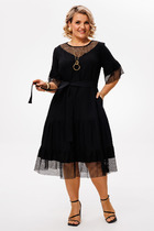 Платье с центральной потайной застежкой на петли и пуговицы, с втачным воротником с отрезной стойкой. По полочкам на уровне линии груди расположены клапаны, на уровне линии бедер- накладные карманы с клапанами. Рукав втачной, короткий. Платье со съемным поясом. По боковым швам расположены шлевки для пояса.