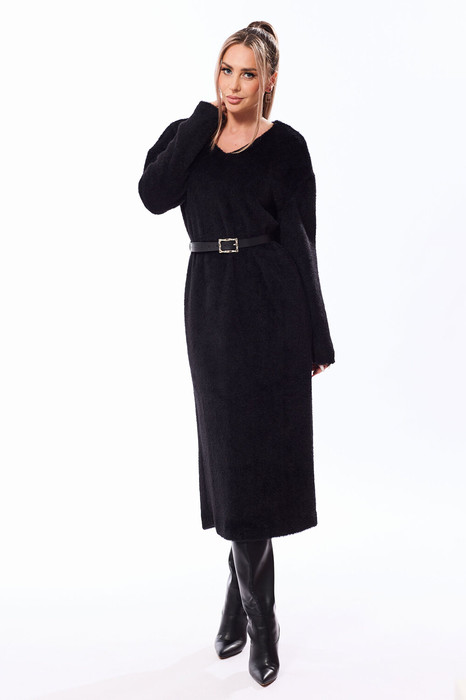Платье беззастежки, без воротника, с V-образным вырезом горловины. Перед цельный, спинка со средним швом, заканчивающимся шлицей. Рукав втачной, длинный. Платье со съемным декоративны поясом из кожезаменителя.