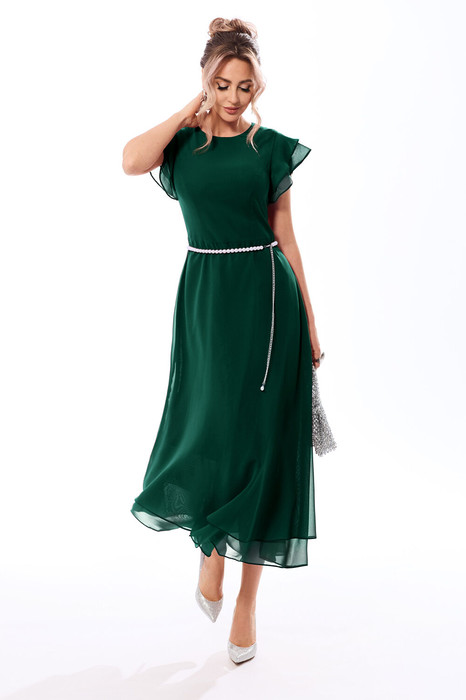 Платье без воротника, с круглым вырезом горловины, с застежкой на потайную молнию в среднем шве спинки. Платье отрезное по линии талии. По лифу переда с рельефами, выходящими из проймы. Спинка со средним швом, по лифу спинки с рельефами, выходящими из проймы. Нижняя часть платья двойная, расширенная к низу. Рукав втачной, короткий, крылышко, двойной. Платье со съемным декоративным поясом.