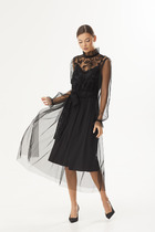 Платье без воротника, с V-образным вырезом горловины, с застежкой на потайную молнию в среднем шве спинки. Платье отрезное по линии талии. По лифу переда с нагрудными и талиевыми вытачками. Спинка со средним швом, по лифу спинки с талиевыми вытачками. Нижняя часть платья расширенная к низу. По низу платья- отрезная кокетка и волан. Рукав втачной, длинный, расширенный к низу.