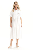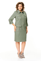 Платье с отрезным присборенным воротником- стойкой, горловина переда с разрезом, застегивающимся на одну навесную петлю и пуговицу. Платье отрезное по линии талии, шов по талии присборен. По низу платья- отрезная кокетка и деталь- гофре. Рукав втачной, длинный, с отрезной манжетой, застегивающейся на одну петлю и пуговицу. Платье со съемным поясом. На боковых швах расположены шлевки для пояса.