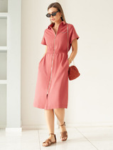 Платье с центральной застежкой на петли и пуговицы, без воротника, с круглым вырезом горловины. Полочки с нагрудными вытачками Боковые швы со шлевками. Платье со съемным поясом. Рукав втачной, 3/4, с отрезной манжетой. Окат и низ рукава со сборкой.