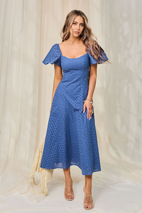 Платье с центральной застежкой на потайную молнию в среднем шве спинки, без воротника, с фигурным вырезом горловины. По переду с рельефами, выходящими из горловины до низа. Рельефы переда с фигурным подрезом по линии талии. Спинка со средним швом, рельефами, выходящими из горловины до низа. Рукав втачной, короткий, крылышко. Горловина спинки и окат рукава присборен на резинку.