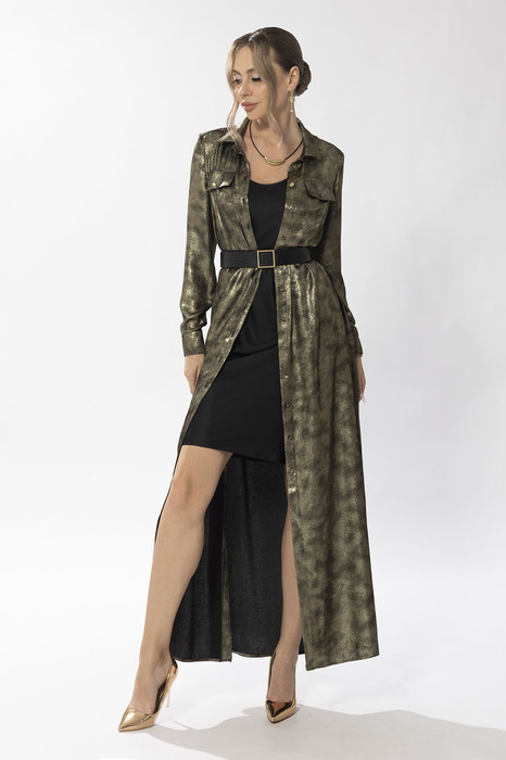 Платье с центральной застежкой на петли и пуговицы, втачным воротником с отрезной стойкой. По переду с клапанами. Спинка с отрезной кокеткой, переходящей на перед. Платье двойное. Нижнее платье на бретелях, с нагрудными вытачками по переду. Платье со съемным поясом.