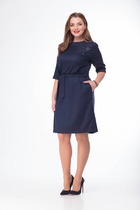 Платье без воротника, с круглым вырезом горловины, застежкой на потайную молнию в среднем шве спинки. Платье отрезное по линии талии. Верхняя часть переда с талиевыми вытачками. Спинка со средним швом, верхняя часть спинки с талиевыми вытачками. Окат рукава присборен. Платье со съемным поясом.