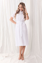 Платье с круглым вырезом горловины, без воротника, застежкой на петли и пуговицы по спинке. Платье отрезное по линии талии, с втачным поясом. Верхняя часть переда с рельефами, выходящими из проймы. Верхняя часть спинки с талиевыми вытачками, фигурным вырезом горловины и фигурным вырезом по низу, застежкой на две петли и пуговицы. Нижняя часть платья со сборкой по шву притачивания к поясу. Рукав втачной, короткий. В боковых швах расположены карманы.