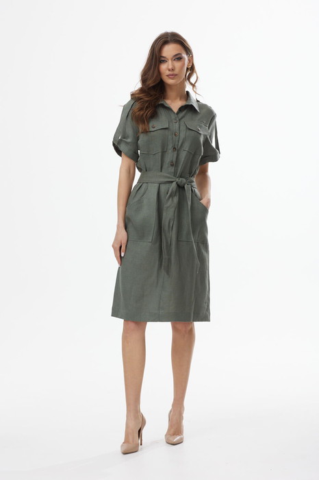 Платье с центральной застежкой на петли и пуговицы, втачным воротником с отрезной стойкой. По переду- накладные карманы с клапанами расположенные на уровне груди. Накладные карманы с цельнокроенной патой расположены на уровне бедер. Спинка со средним швом. Пата рукава переходящая в погон по плечевым швам. Платье со съемным поясом.