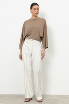 Вязаное свободное платье прямого покроя длиной до линии колена. Рукав втачной прямого покроя стандартной длины. Вырез горловины круглый с невысоким воротником-стойкой. На спинке изделия вывязан круглый неглубокий вырез, обработанный бейкой. По низу платья не передней части имеются два небольших разреза.