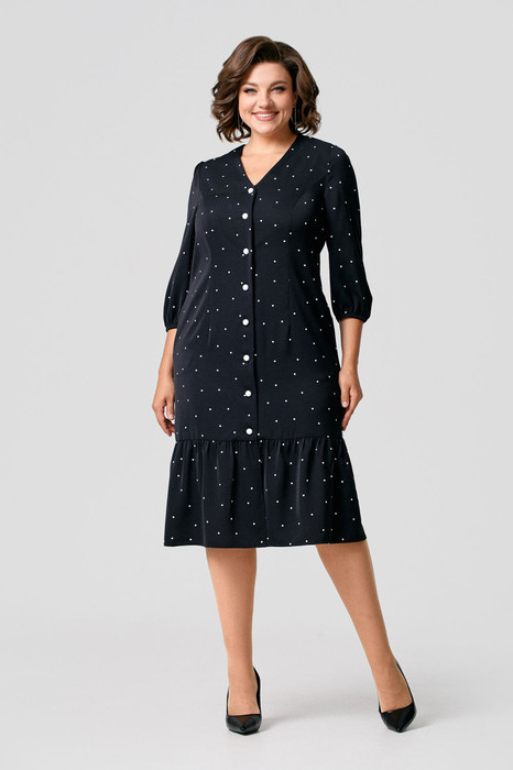 Классическое женское платье полуприлегающего силуэта из мягкой приятной к телу непросвечивающейся ткани в горошек. Платье с V-образным вырезом горловины и втачными рукавами на резинке по низу застегивается на петли и пуговицы. По низу изделия отрезной валан с небольшой сборкой. В комплект входит съемный пояс. Длина 110 см, длина рукава 48 см.