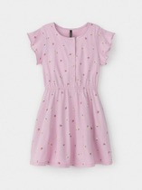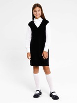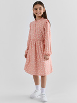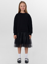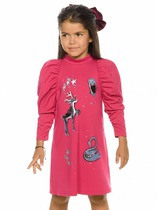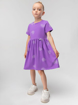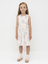 Платье коктейльное для девочки А-образного силуэта, средней длины, с втачными короткими рукавами, круглым вырезом горловины. Застёжка сзади на навесную петлю с пуговицей. Ткань- кружевное полотно на подкладке из кулирного полотна.