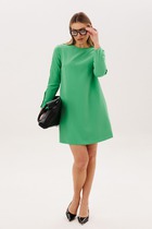 Платье женское повседневное, свободного силуэта, изготовлено из плотной плательной ткани. Перед разрезной с разрезом по центру. В фигурных рельефах обработаны карманы. Горловина с декоративной планкой. Спинка со средним швом. Рукава спущенные с отложными манжетами. Платье декорировано дизайнерской вышивкой.
