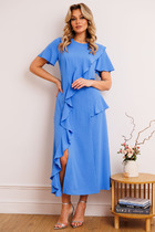 Платье женское А-силуэта выполнено из плательной ткани. Горловина округлой формы обработана обтачкой с кантом из отделочной ткани. Платье разрезное по линии талии, нижняя часть по переду и спинке с небольшой сборкой. Рукава втачные с отложными манжетами из отделочной ткани. В боковых швах обработаны карманы. Пояс платья выполнен путем комбинирования основной и отделочной ткани. Изделие декорировано дизайнерской печатью.