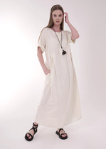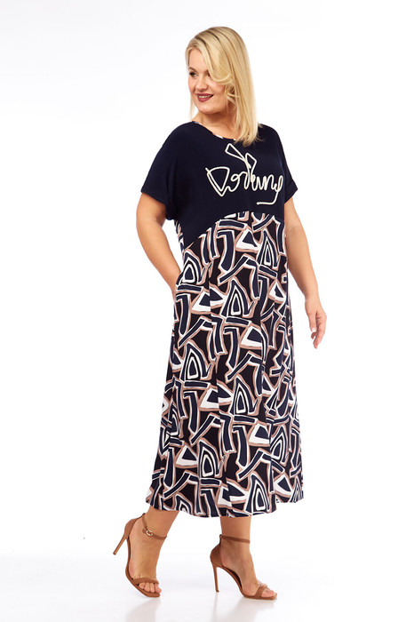 Платье женское А — силуэта, комбинированное. Верх переда и спинки выполнены из трикотажного полотна. Горловина круглой формы, окантована. По переду вышивка шнуром. Спинка разрезная, по горловине  застежка на навесную петлю и пуговицу. Рукава спущенные с манжетами внизу. В боковых швах обработаны карманы.