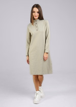 Платье женское прямого силуэта, выполнено из трикотажного полотна. Горловина обработана воротником стойкой, застежка планка на петли и пуговицы. В боковых швах обработаны карманы, по низу шлицы. Рукава спущенные, длинные внизу на манжетах.