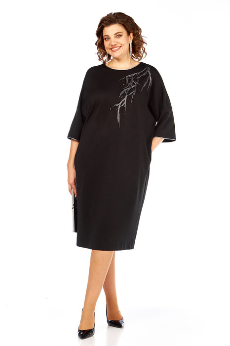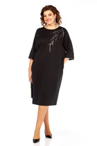 Платье женское нарядное, изготовлено из трикотажного полотна. Горловина круглой формы с кантом. На полочке дизайнерская вышивка. Спинка со средним швом и декоративной застежкой вверху. Рукава спущенные с кантом по низу.