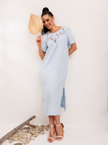 "Платье женское прямого силуэта, изготовлено из натуральной ткани. Горловина круглой формы. По переду обработаны нагрудные вытачки. На спинке средний шов. В боковых швах обработаны карманы, внизу разрезы. Рукава втачные, разрезные с фигурным вырезом. Платье декорировано дизайнерской вышивкой.