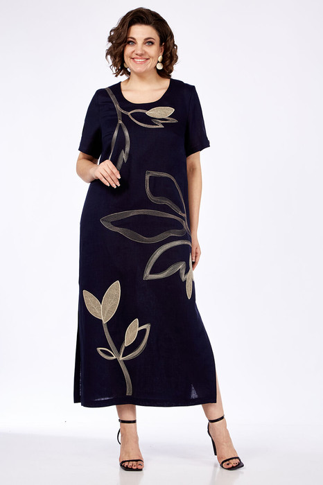 Платье женское прямого силуэта, изготовлено из натуральной ткани.  Горловина круглой формы. По переду нагрудные вытачки. На спинке средний шов. В боковых швах обработаны карманы, внизу разрезы. Рукава втачные, разрезные с фигурным вырезом. Платье декорировано дизайнерской вышивкой.