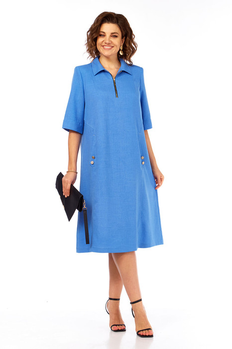 Платье женское, повседневное А-силуэта, выполнено из плательной ткани с эффектом крэша. Платье с отложным воротником и застежкой на тесьму-молнию. По переду обработаны нагрудные вытачки выходящие из плечевого шва и фигурные подрезы в  которых расположены карманы. Спинка со средним швом. Рукава втачные с широкой подгибкой низа.