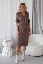 Платье отрезное по линии талии, со сквозной центральной застежкой на кнопки. По переду лифа расположены накладные карманы с клапаном, застегивающиеся на кнопку, заложены складки в области талии. Спинка лифа с отстрочной кокеткой и небольшими складками. По переду юбки расположены большие накладные карманы с наклонным входом. По талии спинка присборена на резинку. Плечо спущено. Рукав одношовный, длиной ниже локтя, по низу обработан притачной манжетой с планкой, застегивающимися на кнопки.  По горловине воротник рубашечного типа с отрезной стойкой. Низ платья с широкой подгибкой. Все отделочные строчки выполнены гарусной нитью контрастного цвета. Платье комплектуется съёмным поясом из основной ткани, затягивающимся на декоративную пряжку.