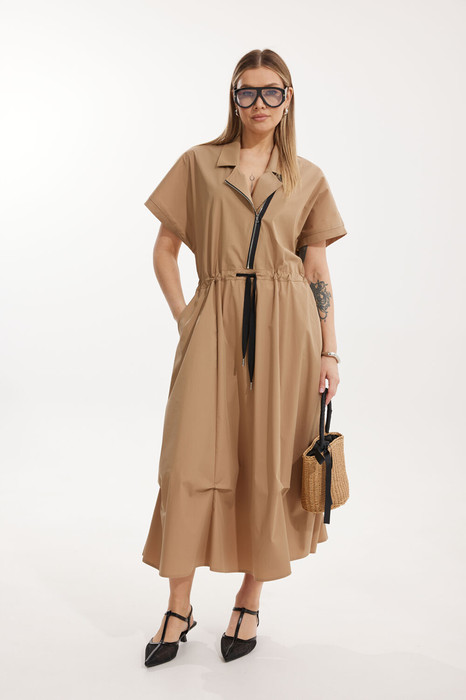 Платье женское полуприлегающего силуэта Отрезное по линии талии со спущенной линией плеча. По переду отрезного лифа платья располагается декоративная застежка-молния. Спинка лифа цельная, отрезная. Горловина обработана отрезным втачным воротником с лацканами пиджачного типа. Отрезная юбка состоит из 6 клиньев и наклонных карманов с отрезным бочком. Лиф и юбка соединены через отрезной пояс, в котором располагается кулиса с контрастным шнуром. По низу юбки застрочены защипы.