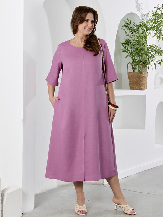 Платье женское из гладкокрашеного тканого полотна, свободное,слегка расширенное к низу, с горловиной овальной формы, короткими втачными рукавами, вытачками в области груди, карманами в боковых швах. Перед состоит из двух частей, в шве соединения деталей по центру разрез, горловина окантована основным материалом.