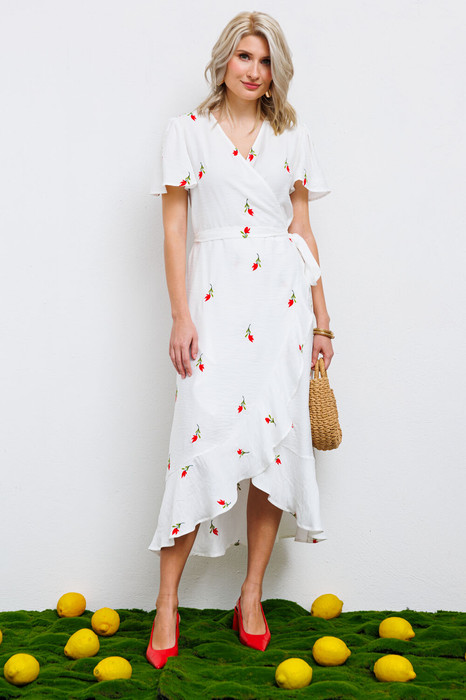 Платье на запах с воланом по низу. Платье отрезное по линии талии. прилегание по фигуре вы можете сами регулировать с помощью притачного пояса. В нем вы будете женственной и романтичной.