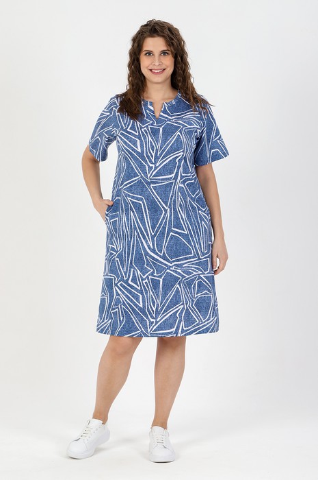 Платье женское из трикотажного полотна «кулирка» с набивным рисунком прямого силуэта, с короткими втачными рукавами, карманами в боковых швах, горловиной овальной формы, обработанной обтачкой из основного материала, с разрезом в центре. В нижней части боковых швов – разрезы.