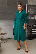 Платье женское, полуприлегающего силуэта, с втачными рукавами, длиной до коленей. Деталь переда платья с нагрудными вытачками, вверху расположена аппликация-печать и прикреплены «пайетки с бусинами». Деталь спинки платья со средним швом, который заканчивается разрезом. Рукава втачные одношовные, короткие. Вырез горловины платья округлой формы, с втачной бейкой. По низу платья съемный элемент из отделочной ткани, который застегивается на 15 петель и 15 пуговиц.