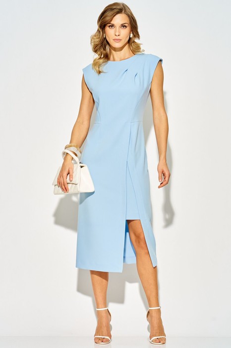 Вырез горловины платья округлой формы. Деталь переда с полурельефами, на уровне линии талии в боковых частях горизонтальные подрезы. Левый рельефный шов заканчивается фигурным разрезом со вставкой. На левом плече обработаны 2 складки. Спинка платья со средним швом и с полурельефами, на уровне линии талии в боковых частях горизонтальные подрезы. В среднем шве спинки с застежка на потайную тесьму-молнию.