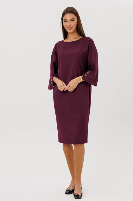 Стильное платье-баллон прямого силуэта со спущенной линией плеча и эффектным рукавом со шлицей.