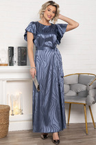 Элегантное платье, отрезное по линии талии из воздушного шифона на подкладке. В верхней части изделия расположены нагрудные горизонтальные вытачки, по спинке и полочке: вертикальные талиевые. Линия горловины оформлена в форме «лодочка». Нижняя часть платья по крою: «полусолнце». В среднем шве спинке потайная застежка-молния. Рукав втачной, одношовный. По окату и низу рукава-сборка. Длина платья по спинке 111 см. Длина рукава 62 см.
