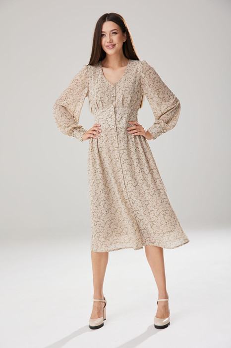 Воздушное элегантное платье нежного светло-бежевого оттенка с изящным цветочным принтом. Прекрасная посадка на фигуре. Изделие состоит из отрезного лифа, спереди со складками по линии груди, по спинке - сборка. Юбка изделия имеет расклешение к низу, по талии фрагментами сборка. Лиф и юбку соединяют облегающие рельефные детали, имитирующие фигурный корсет, высотой от 7.5-12 см. Спереди платье на застежке: петли/пуговицы. Горловина имеет V-образный вырез. Рукав втачной, одношовный, с притачной манжетой. Длина рукава в готовом виде 65,5 см. По окату и низу рукава-сборка. Спереди платье имеет застежку на петли-пуговицы. Длина платья по спинке 112-115 см. (согласно размерному ряду). Платье на трикотажной подкладке телесных оттенков (лиф платья и юбка.)