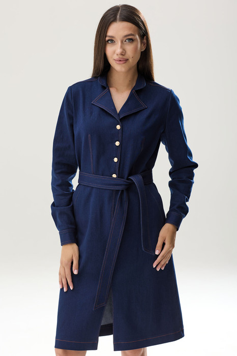 Стильное платье в спортивном стиле для самых модных девушек! Силуэт – трапеция. Воротник – стойка, отложные лацканы заострённой формы, застёжка центральная бортовая на три петли-пуговицы. Отрезное по талии. Верхняя часть спинки с притачной кокеткой. По спинке – талевые вытачки. По среднему шву переда – разрез. Фигурные боковые карманы. Длина платья по спинке от горловины до низа 103 см. Рукав – втачной, одношовный, с притачной манжетой, высотой 5 см, на функциональную застёжку на петли – пуговицы. Длина рукава с манжетой – 63 см. Завязывающийся пояс подчёркивает талию. Цвет платья может отличаться на полутон от заявленного на фото.