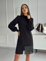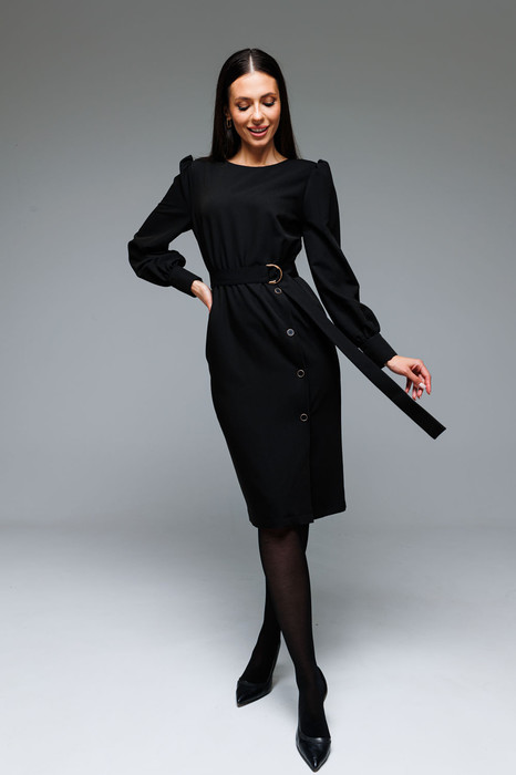 Восхитительное платье на любой случай! Платье отрезное по линии талии. Лиф с нагрудными и талиевыми вытачками. На спинке-талиевые вытачки, которые делают силуэт изящнее. По линии талии, для балансирования размерного объема, в шов вставлена эластичная тесьма (резинка, шириной 1 см). Горловина округлой формы. По окату и низу рукава-сборка. Рукав втачной, одношовный, длиной 64,5 см на манжете, высотой 8 см и застежкой на петли-пуговицы. Нижняя часть платья-прямого силуэта, чуть зауженная к низу. По линии талии также расположены талиевые вытачки. Конструктивная деталь - смещенный разрез с контрастными планками на пуговицах, разрез функциональный. В среднем шве спинки расположена застежка - потайная молния. Длина платья по спинке 105 см. Длина юбки платья от талии 66 см.